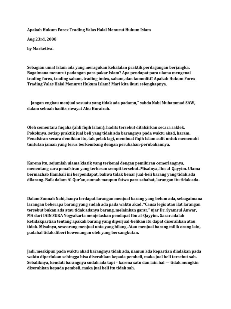 Janganlah engkau menjual perak ditukar dengan perak melainkan sama dengan sama, dan janganlah engkau melebihkan salah satunya dibanding. Tapi kebanyakan ulama besar di dunia memfatwakan bahwa hukum forex dalam syariat islam adalah mubah atau boleh. Fatwa mui forex halal atau haram menurut syariat islam.