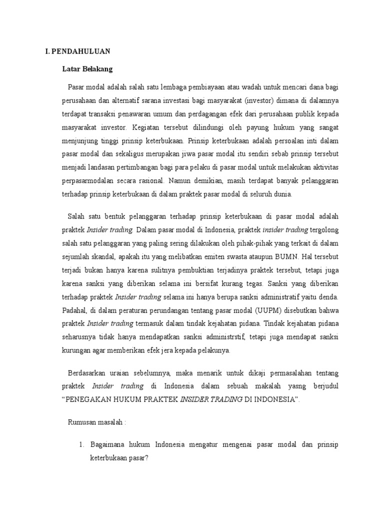 Tinjauan yuridis kasus insider trading yoshiaki murakami di jepang dikaitkan dengan penegakan hukum insider trading di indonesia skripsi jahotman ambarita 0806321713. Semen gresik) kasus insider trading pgn kasus insider trading pgn bermula dari anjloknya harga saham pgn sebesar 23,32% dari rp9.650 menjadi rp7.400 per saham pada 12 januari 2007. Menurut dia, kasus yang menjerat kliennya itu masuk dalam ranah pasar modal, bukan perkara tindak pidana korupsi.